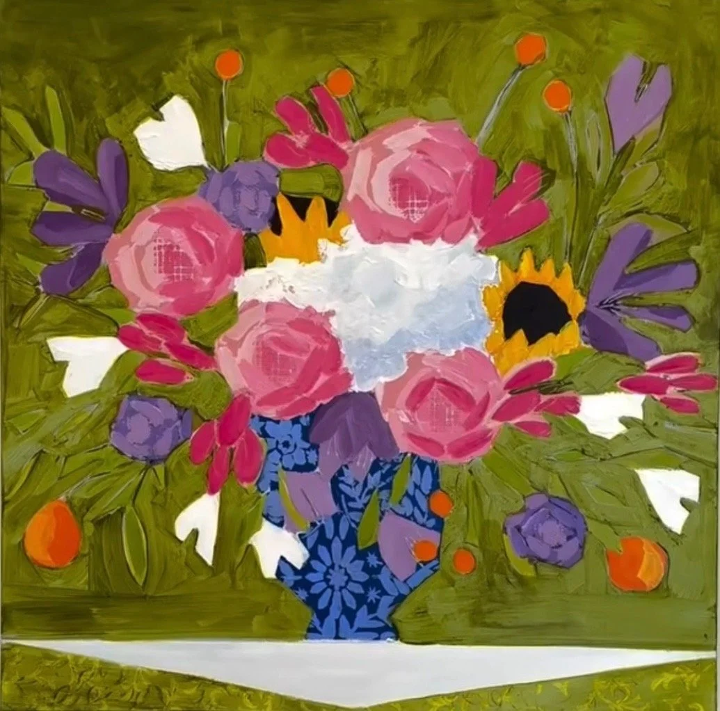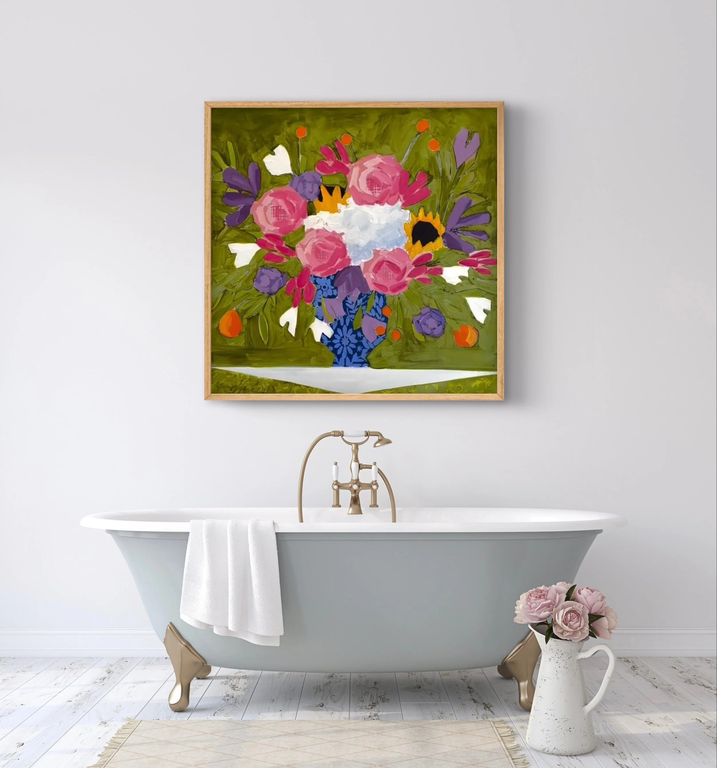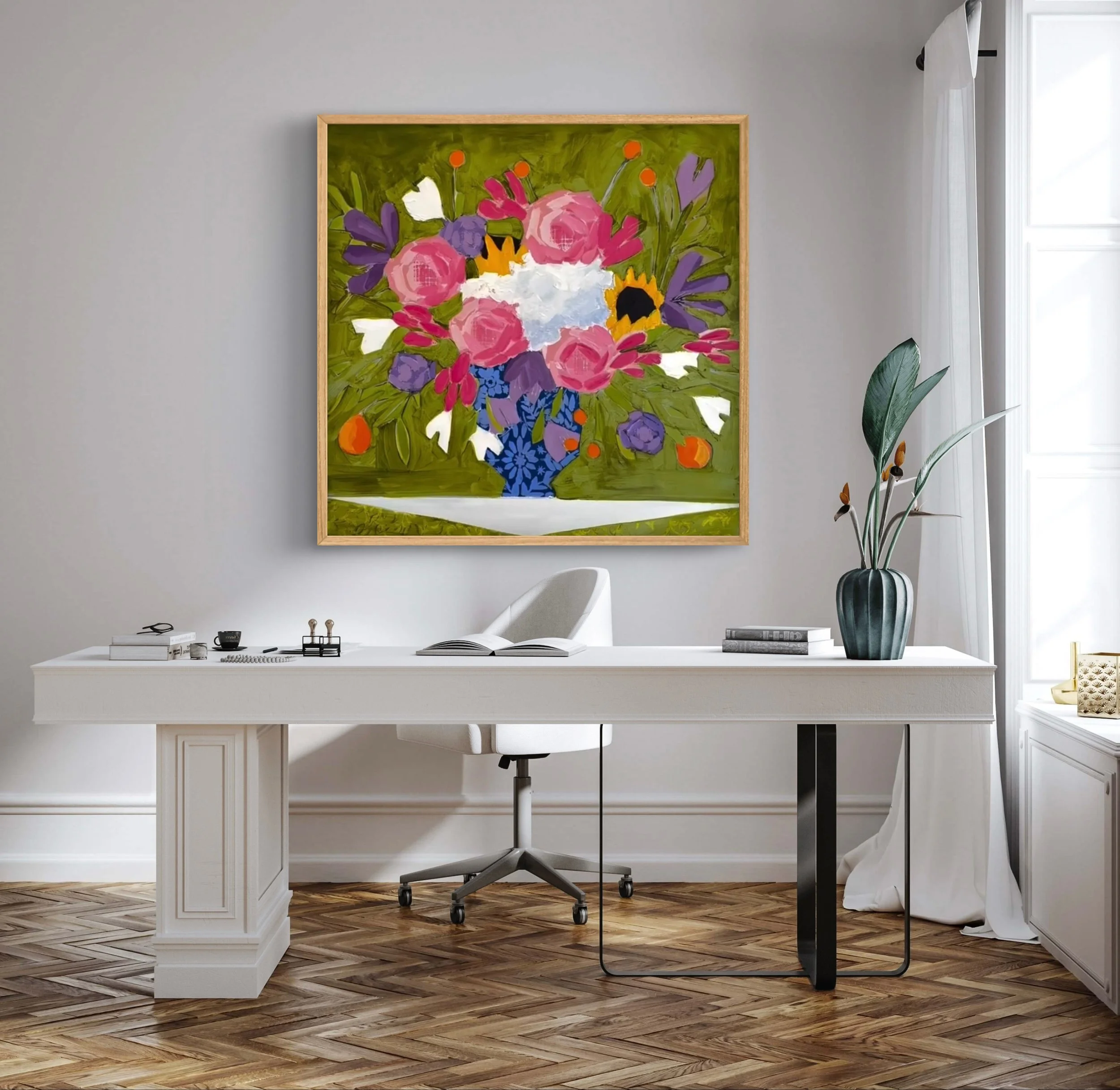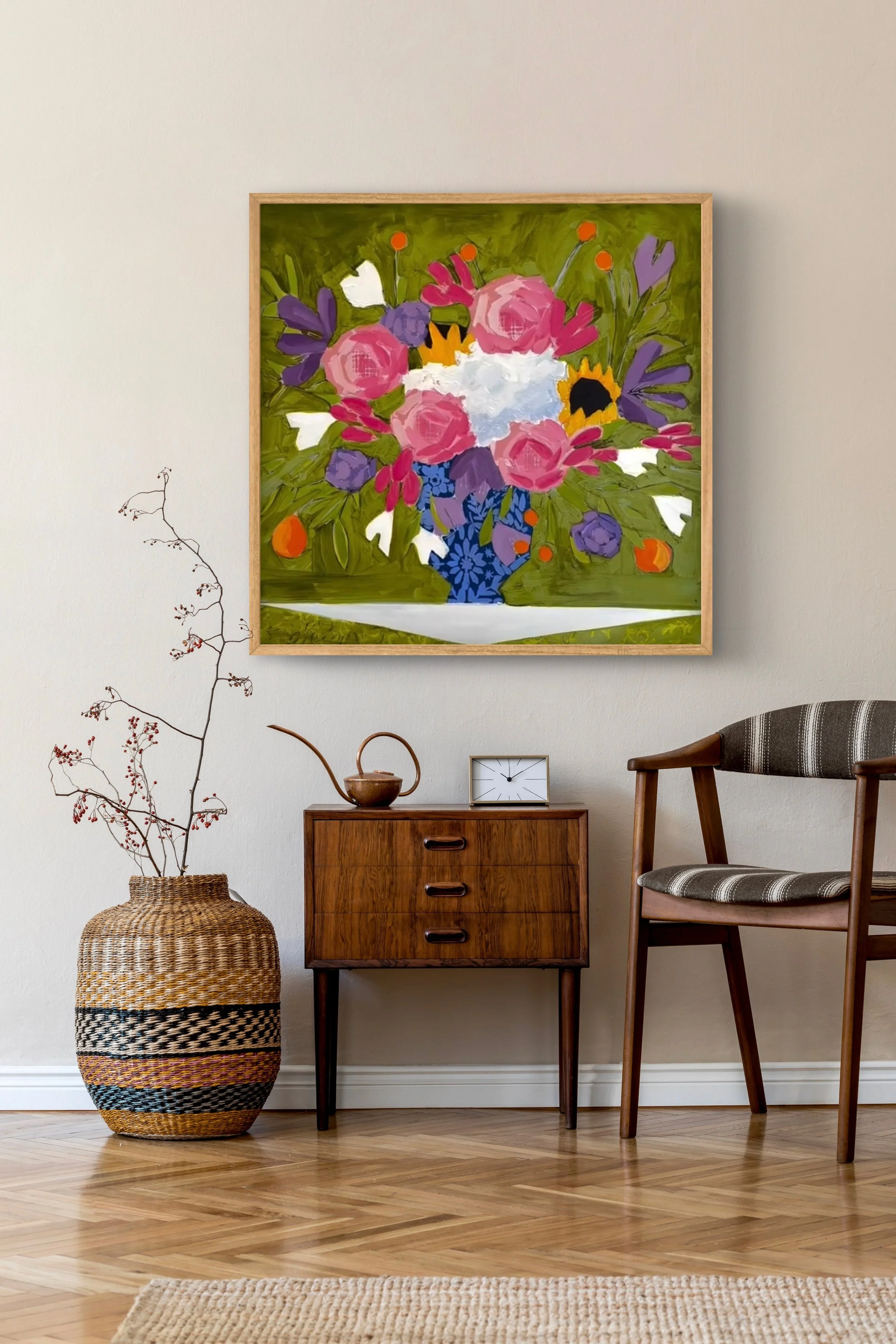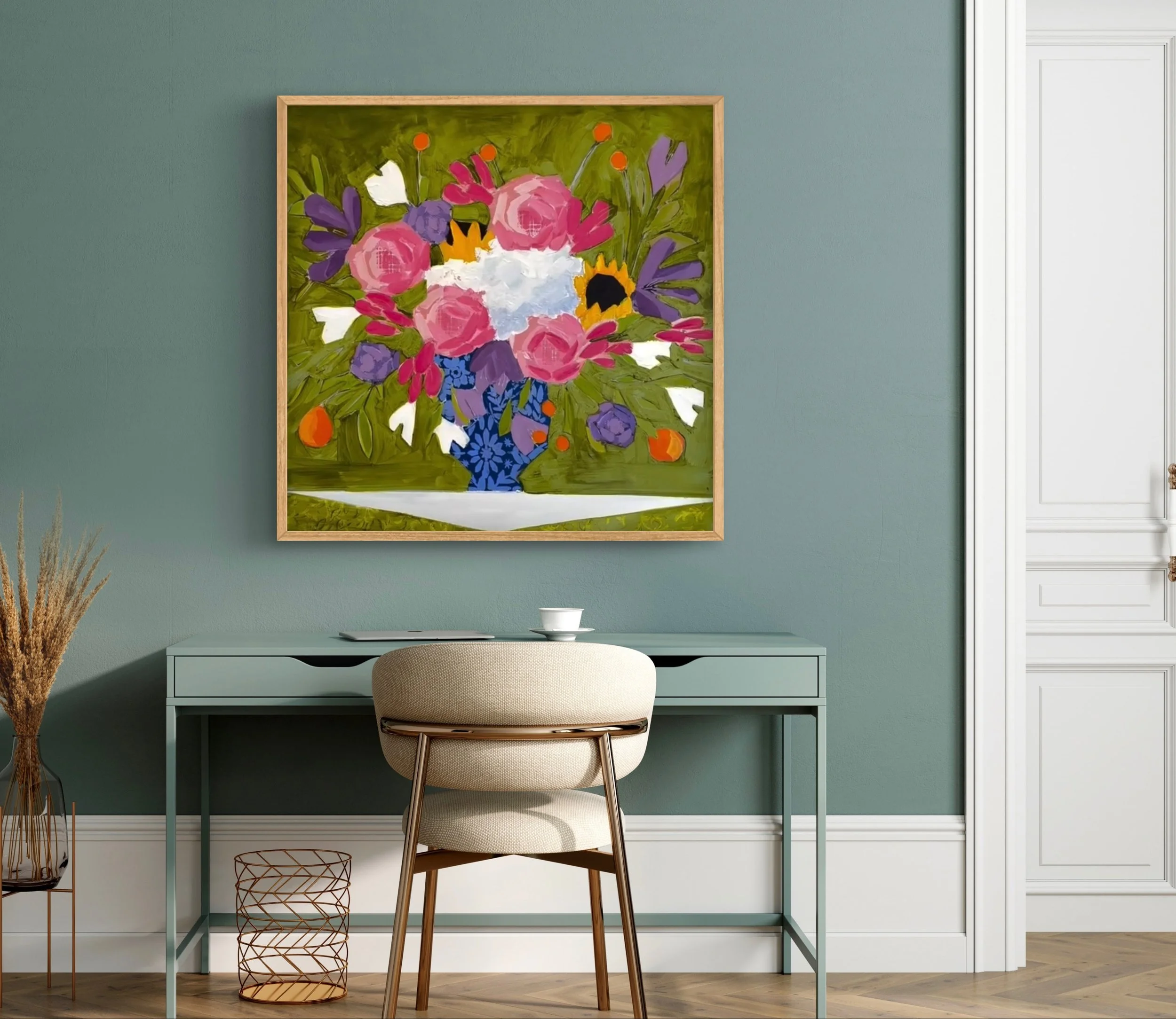 Acrylic original art floral painting on 30X30 gallery edge wrapped archival canvas. Painted to delight you, add to your happiness and, most importantly, remind both of us the importance of lovely character in our lives. The flowers represent the character traits I love to share which are described, at length in Proverbs 31 as well as Galations 5:22,23.